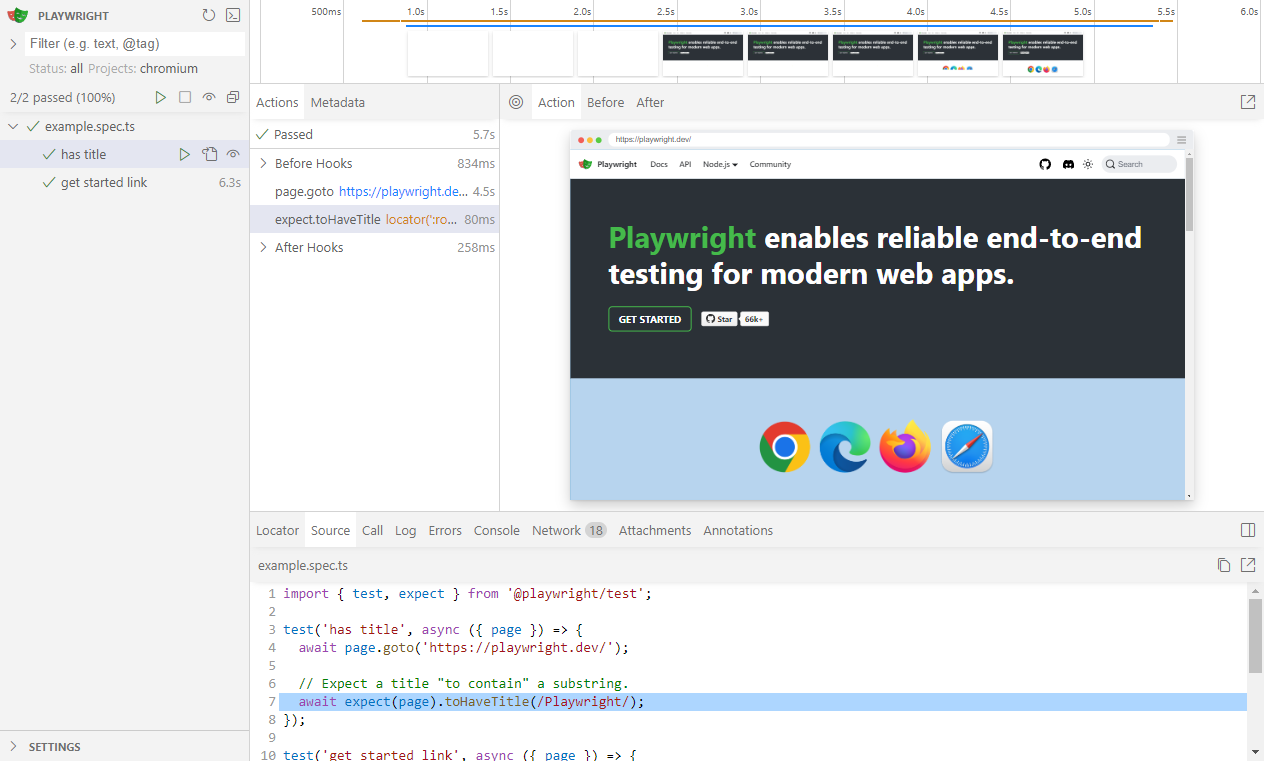 | npx playwright test –project=chromium | Runs the tests only on Desktop Chrome. |